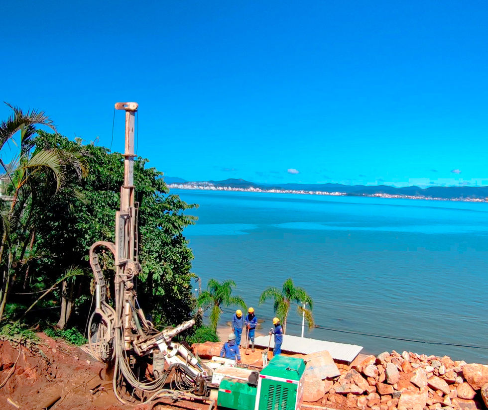 O acesso ao local foi um grande desafio para nossa equipe e exigiu muito planejamento e organização no canteiro de obras. A execução das estacas teve que ser feita em dois patamares principais, por se tratar de um terreno com grande declive, fato este que levou ao uso de argamassa usinada nas estacas, com entregas programadas e maior coordenação sobre os processos de perfuração e injeção de argamassa.